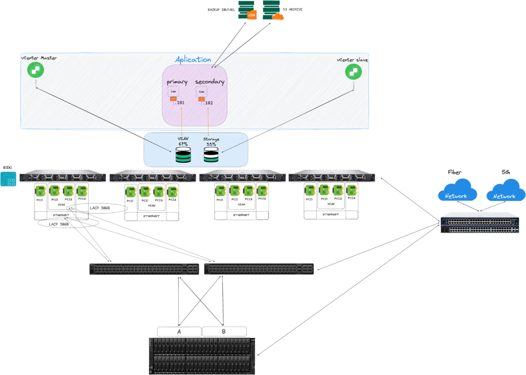 O armazenamento roda sobre VMware vSAN configurado em RAID1, assegurando espelhamento de dados entre hosts.