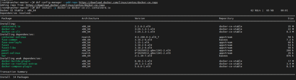 O Rancher utiliza o Docker como runtime de containers. Por padrão, o Rocky Linux 9 e o AlmaLinux 9 vêm com Podman, que deve ser removido para evitar conflitos.