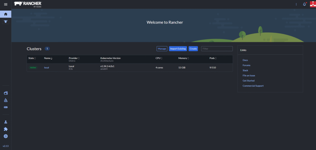 Após concluir essas etapas, você será redirecionado para o dashboard do Rancher.
