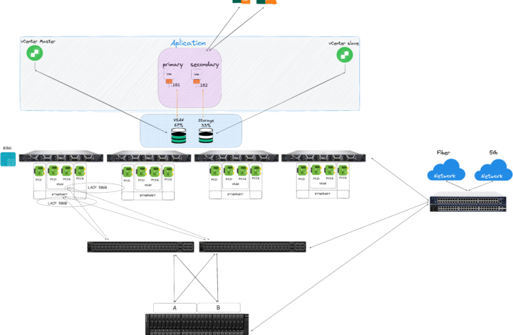 E, indo além da replicação, os serviços foram intencionalmente distribuídos entre o vSAN e storages dedicadas — exemplo: quatro controladores de domínio (AD), sendo dois no vSAN e dois em storage independente.